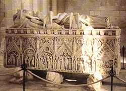 the end of 1348, the Prince openly lived with Inęz. In Castile the nobles were in revolt against their King Pedro, and to obtain military help, they offered the crown of Castile to the Infante Dom Pedro. The liaison between the Prince and the conspirators was Inęz, already the mother of his children. Dom Afonso IV did not want to be involved in the Castilian squabble at all, and was very derogatory in his attitude to "this 'spy, Inęz" and her brothers, who were also exerting their influence over Prince Pedro. One day, early in January 1355, his courtiers, who were jealous of the power of the Spanish at court, persuaded the King, Dom Afonso IV, to dispose of Dona Inęz. The decision was taken in conference with his councillors at Montemor-o-Velho. Accordingly, while his son was out hunting, he visited their Quinta, at Coimbra. He was so affected by Inęz' beauty, her tears and those of her young children, that he determined to spare her, much to the disgust of the three knights who had accompanied him, and who were only waiting for his order to carry out the deed. The Quinta was thereafter called the Quinta das Lagrimas - the Farm of Tears. Riding away, the knights eventually persuaded Dom Afonso that she had to go. As soon as the King agreed, they returned to the farm and Dom Pedro Coelho, Dom Diogo Pacheco and Alvaro Gonçalves murdered the beautiful Inęz de Castro, wife of Infante Dom Pedro, at the Fonte dos Amores, Coimbra. Dona Inęz was buried in the old Convent da Santa Clara, Coimbra. There then followed a Civil War between Dom Afonso and his son Dom Pedro, who was maddened by his rage and grief. He was considered to be insane from the day that Inęz was killed until his death. Yet despite his devastation, he still took lovers, and on the 14th August. 1356, his mistress, Teresa, presented him with Joăo, who was to be the Master of the Order of Aviz, and later elected King. When Dom Pedro came to the throne, one of his first edicts was that of the Fontes dos Amores. This fountain had a conduit that led to the Convent de Santa Clara. When King Afonso had confined Inęz to this convent, Dom Pedro had communicated with her through this watercourse. The Edict stated that whosoever should damage the conduit would be condemned to 30 days imprisonment. The coronation of Dom Pedro did not take place until 1361. Before the event Dom Pedro swore solemnly upon the gospels the reality of his private marriage with Inęz de Castro and insisted that she be taken from her tomb and crowned with him. At the coronation ceremony the nobles were expected to express their loyalty by kissing the decaying hand of the Queen. During the coronation banquet two of her three murderers were tortured and their hearts were torn from their living bodies outside the windows. The third murderer, Diogo Pacheco, is said to have escaped capture. After the ceremony the crowned Inęz was reburied as queen, with great pomp, in the magnificent sarcophagus prepared for her at the Cistercian Abbey Church of Alcobaça. The heavily carved tomb is decorated with scenes from her life, with a portrayal of the Crucifixion at the head and the Great Doom at the foot. Surrounded by angels, she lies supported on six gargoyle-like representations of her murderers and enemies. Dom Pedro died in 1367. As he requested in his will, he was buried in a sarcophagus, the pair to that of Inęz, in the great Monastery church. Inscribed on his tomb are the words "Até ao fim do mundo" Until the end of the world. In this Gothic monument, the embellished tombs of Pedro and Inęz are still positioned strictly in accordance with his wishes, and against custom. The King lies in the South transept with his feet to the North, and Inęz in the North, with her feet to the South. Thus, on the Day of the Last Judgement, the first person who will greet the eyes of Pedro, as he rises from his grave, will be his beloved, fair Inęz. That is, if there aren't any tourists getting in the way! |