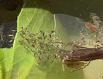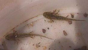 Despite the lack of rain this Winter (1998/9), unidentified tadpoles have hatched in the small puddles in the Almádena River. They have just been rescued, else they would have joined those whose parents chose too small a puddle and have become food for the ants and the flies. Now they could be prey for the cats as they are residing in a small tank near where the cats sunbathe.